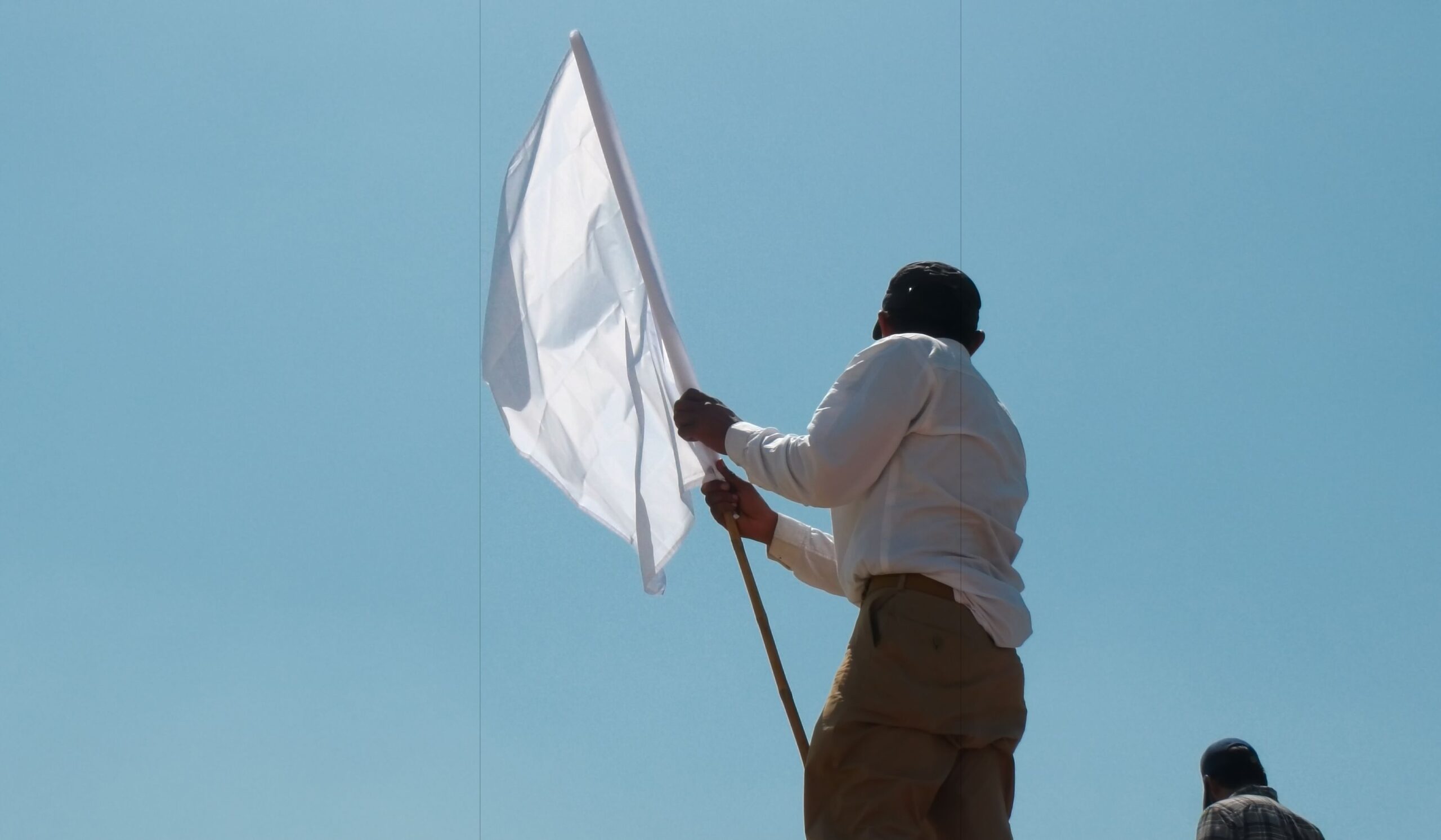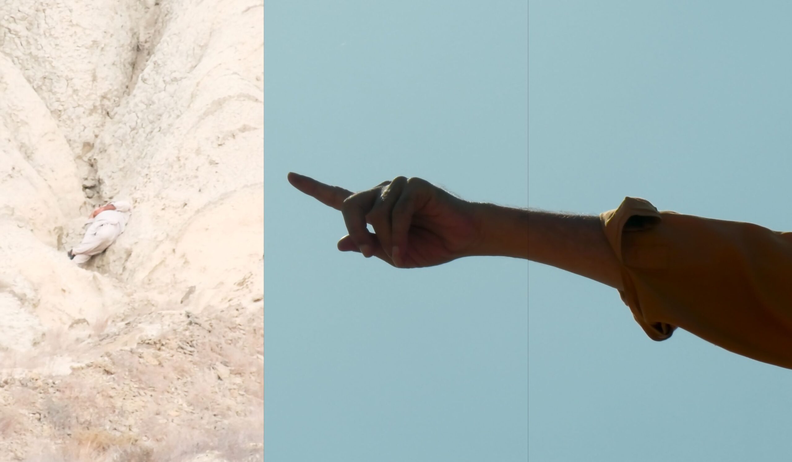 Through the prism of cinema, the work traces the dangerous journeys of undocumented migrants across vast lands, exploring distance as a condition of diasporic lives just as it is a position intrinsic to the act of filming. The artist invited a crew from the cinema industry of his native Lahore—also known as Lollywood—to script and direct a series of sequences, the narrative of which would be loosely based on videos found online. Recorded by migrants as they travel from South Asia to Europe, such videos give insight into the harshness of their peregrinations––which often last for years and sometimes do not reach the intended destination––as well as offering practical pieces of advice to those who have yet to depart. The artist edited the remade footage into poetic sequences where, however, only the conditions of their assembly are visible. Screenshots of the original videos appear occasionally on the script sheets, while excerpts are played on the crew members’ phones. Rather than attempting to represent the migrants’ experiences, the artist evokes them through the exhaustion of the crew under the scorching sun, the difficulties faced by the cameramen in locating the actors lost in the barren landscape, and the exaggerated gestures of the directors as they coordinate the filming from afar. The work was conceived in spatial and symbolic dialogue with the church of Santa Maria dei Derelitti: the dramatically foreshortened framing is inspired by that of the altarpieces surrounding the installation, and the day-to-night unfolding of the film reverberates with that of the church . Entirely created in a recording studio, the soundscape amplifies the divergence between what we see and what we hear, between the near and the far. It is an integral part of an investigation that looks for moments of truth in the mise-en-scène, for facts within fiction. The work considers the landscape thematically, as a physical and existential space through which to navigate in search of salvation, while underlining the distance between the image as testimony and the image as product, between those who experience dislocation and those who are spectators to it.