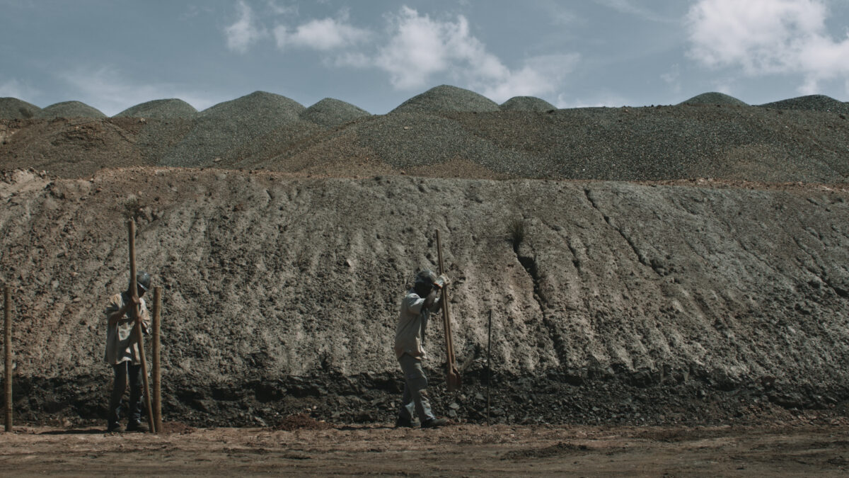 A family is sitting amid what is left of their home, their belongings piled up in the open air without shelter, while bulldozers shift piles of raw material with relentless aggression. A few moments later, members of the family walk away with whatever small items they can carry on their backs, while a worker prepares the ground for the erecting of a barbed-wire fence. The persistent sound of cargo trains haunts the visually stunning but despoiled landscape in a reminder of how money never sleeps. Through a series of allegorical vignettes, Acumulação Primitiva looks at the ongoing material consequences of colonialism and capitalism on people and the land, as epitomized by the scene in which a white man is being carried by a Black man, who pants and struggles in an effort to keep going as the gravel moves dangerously beneath his feet––an homage to Lev Tolstoy’s observation that “the rich will do anything for the poor, except get off their backs.” Simultaneously engaging with the past and present of generations who have been dehumanized, dispossessed, and expelled—when not erased entirely––the work pays tribute to the survivors who bear witness to and resist the damage being continually wrought upon them by economic and political forces. Acumulação Primitiva is the second chapter of Trilogia do Capital (Capital Trilogy, 2021–ongoing), an investigation into economic concepts, their theological origins, and their tendency towards abstraction. The Marxist notion of “primitive accumulation” is evoked here to visualize the relationship between the violent expropriation of land, the commodification of labor power, and the racialized class structure, which combine to fuel the reproduction of capitalism to this day. It follows the first chapter, Dívida (Debt, 2021), which portrayed the concept of debt as a boulder looming over humanity; one which people try in vain to climb over.