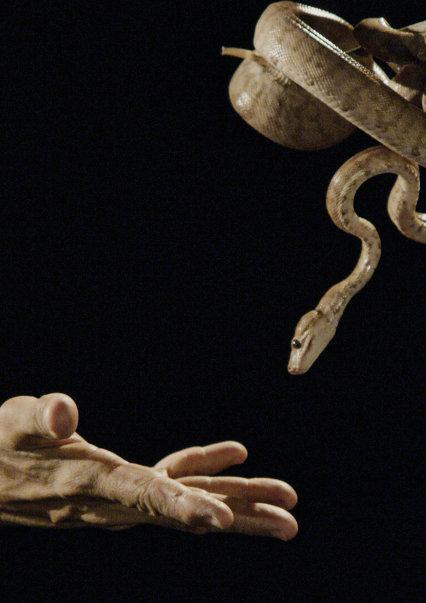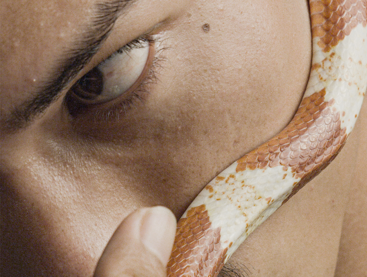 The video Nó Na Garganta [Knot in the Throat] invited a group of young people working in a private zoo to interact with snakes. The images of quiet and close interaction between species gain narrative intensity with zooms into various parts of the body of the performers, such as eyes, ears, mouths, feet, and noses, thus emphasizing the senses through which humans interact with their surroundings. The montage becomes progressively agile and culminates in documentary scenes of ecological disasters, which seem to remind us of humanity’s disconnection from nature.